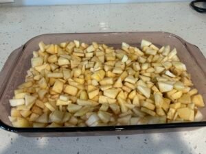 • Transfer to baking dish: Pour coated apples into a greased 9×13 baking dish and spread evenly.