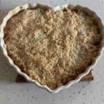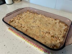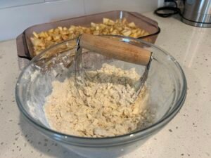 • Top and bake: Sprinkle the crumbly topping evenly over the apples in the baking dish.