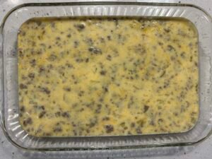 • Bake the egg casserole: Pour the mixture into the greased baking dish and spread evenly. Bake for 30–35 minutes, or until the edges are golden and the center is set.