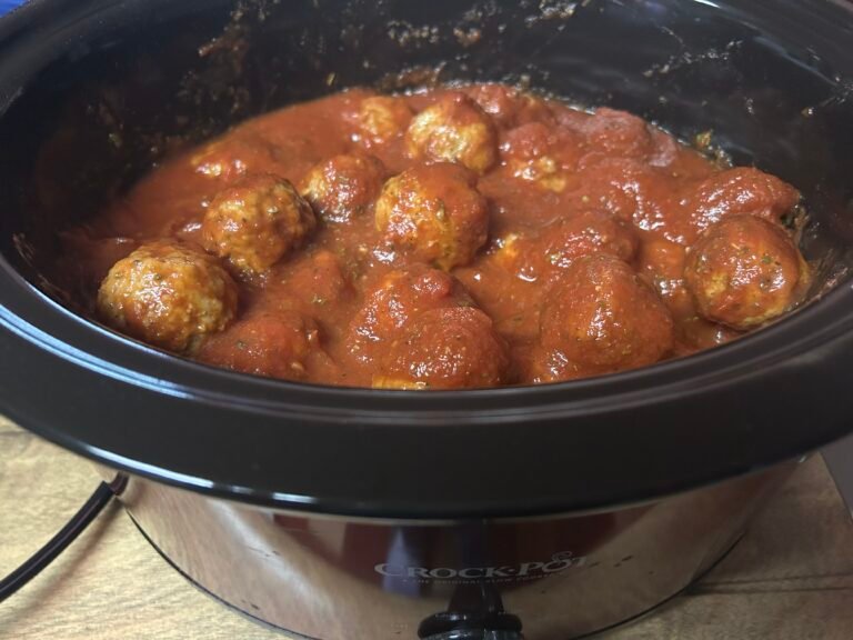 On this frugal living Friday, I emptied a bag of frozen store bought meatballs into my crockpot and covered them with pasta sauce, petite diced tomatoes, and seasonings.