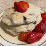 WE love to top our chocolate chip pancakes with fresh sliced strawberries. These pancakes are wonderfully paired with sausage cheese balls and a smoothie. How do you eat your pancakes?