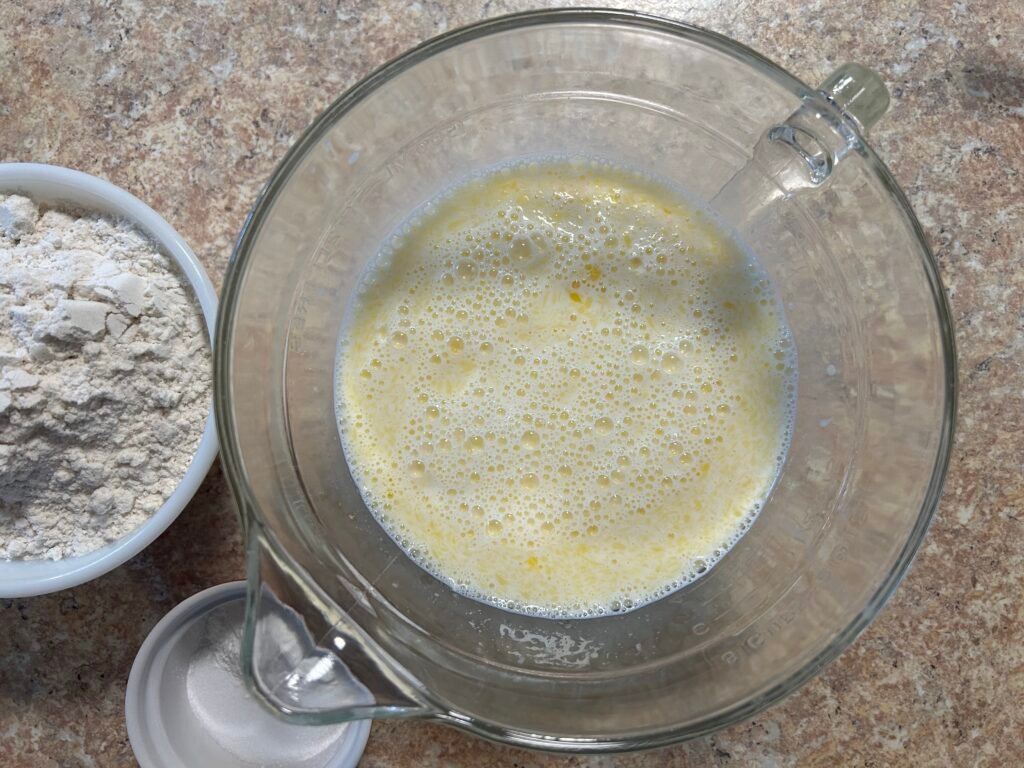 Combine the three eggs, milk, and melted butter in a large mixing bowl.