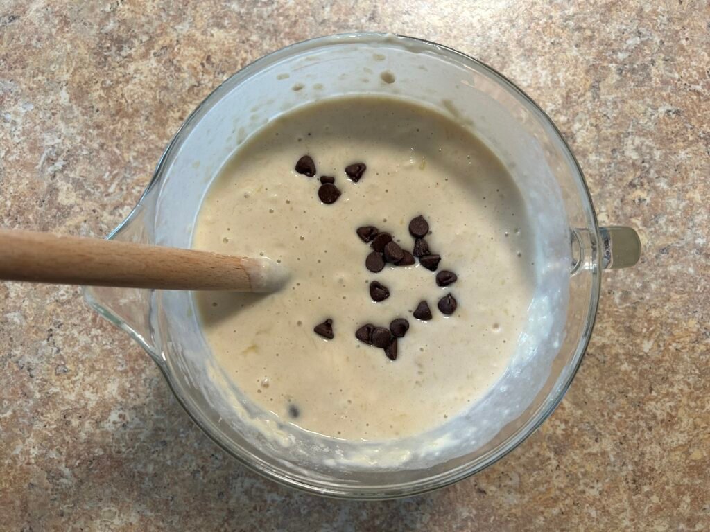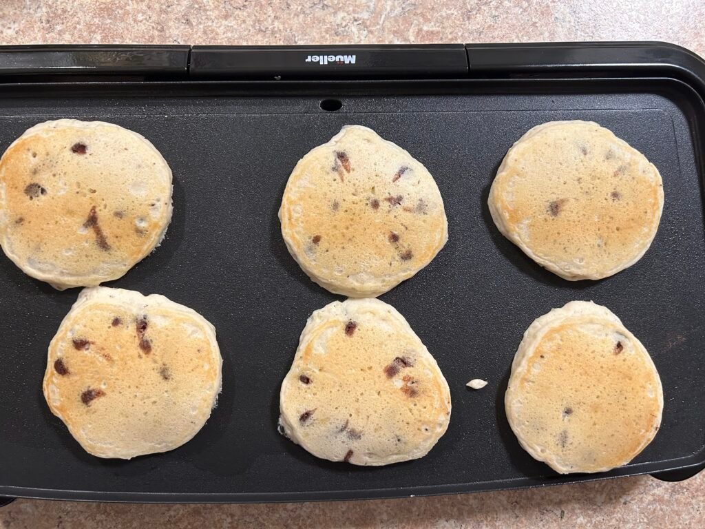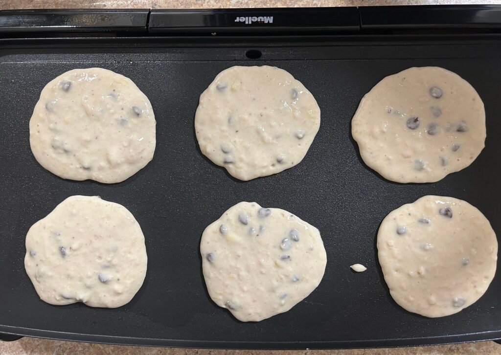 Including add-ins into your pancakes can be delicious. Our family loves adding chocolate chip to the pancake batter and we do it often. We add between 1/2 – 3/4 cup of dry or fruit add-ins.